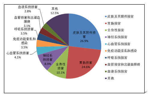 2019年國家基本藥物化學(xué)藥品和生物制品不良反應(yīng)/事件報(bào)告,按照藥品類別統(tǒng)計(jì),報(bào)告數(shù)量排名前5位的分別是抗微生物藥、心血管系統(tǒng)用藥、抗腫瘤藥、激素及影響內(nèi)分泌藥、治療精神障礙藥;累及器官系統(tǒng)排名前5位的是皮膚及其附件損害、胃腸損害、全身性損害、神經(jīng)系統(tǒng)損害以及血液系統(tǒng)損害。